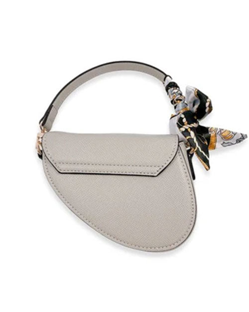 This timeless saddle design is elegantly accented with a tied scarf and features a removable gold chain for versatile wear.
