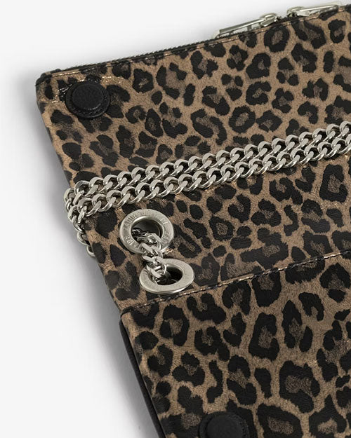 Crafted from lustrous metallic leather adorned with a striking leopard pattern, this sophisticated clutch seamlessly transitions from evening events to refined daytime occasions. The signature curb chain with distinctive eyelets offers versatile styling options, while dual closures—a secure zip and magnetic snap—ensure your essentials remain protected. An interior plated pocket and flat back exterior pocket provide practical organization. Designed for effortless versatility, wear it as a shoulder bag or cross-body style to suit your mood and occasion.